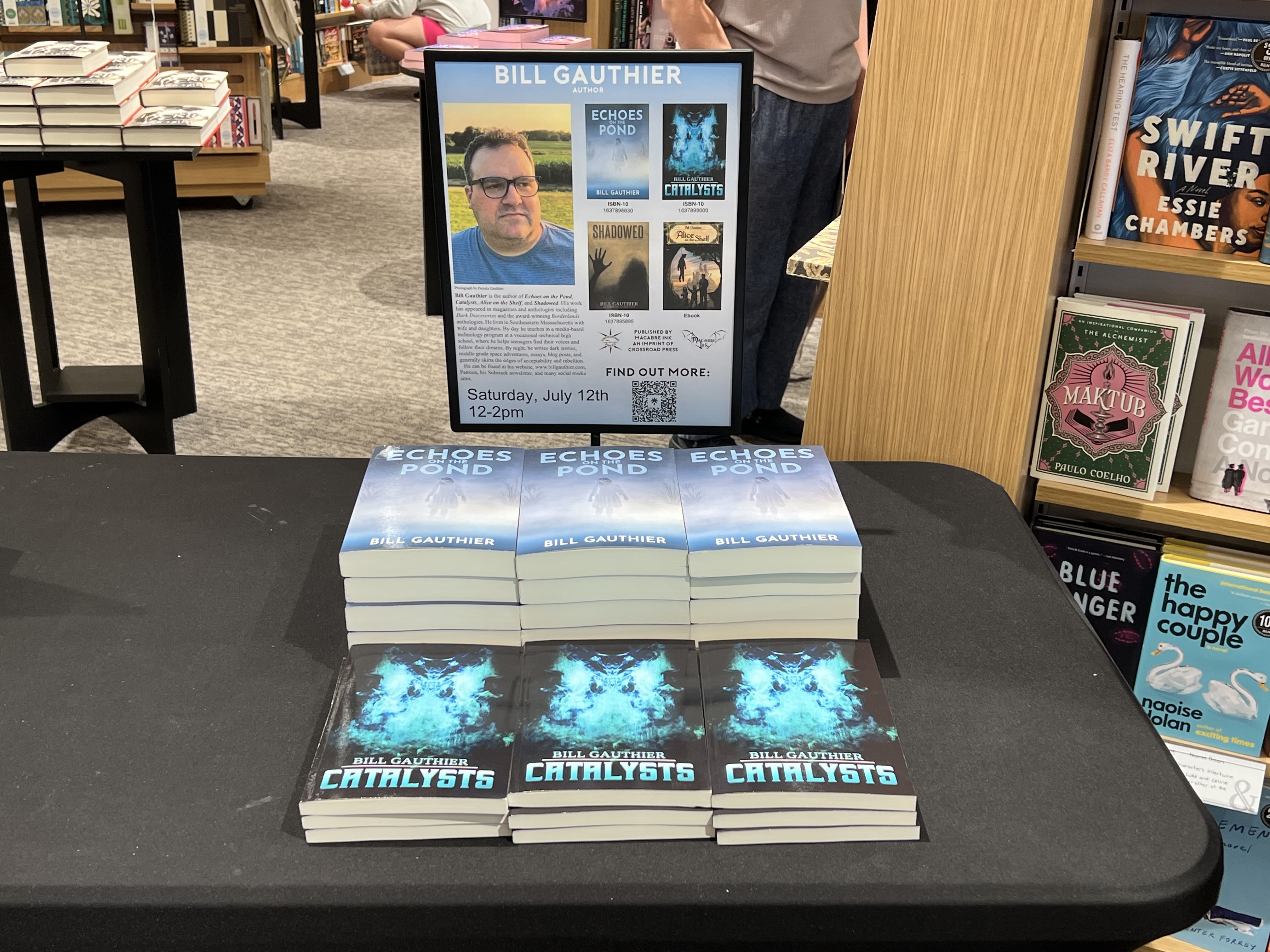 Here is what I walked into. Wait. Did that sound right? I don’t know. Anyway, that’s the table with my books. I designed the sign and sent it to the store. They added the date and put it in the sign. It looks good, I think. I even used a QR code because I’m modern.