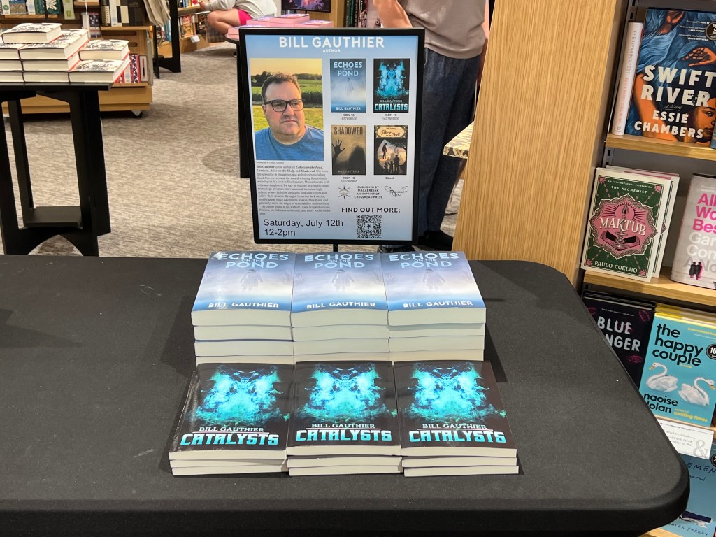 The way that the book signing was worse than Open House is that in the latter, you’re deflecting the whole time. It’s about the students, it’s about the career technical program, it’s about the school, it’s almost never about me. The book signing is about me. Or rather, books that I’ve written. On the table next to me was nearly twenty-five years of work between the stories in Catalysts and the novel Echoes on the Pond.