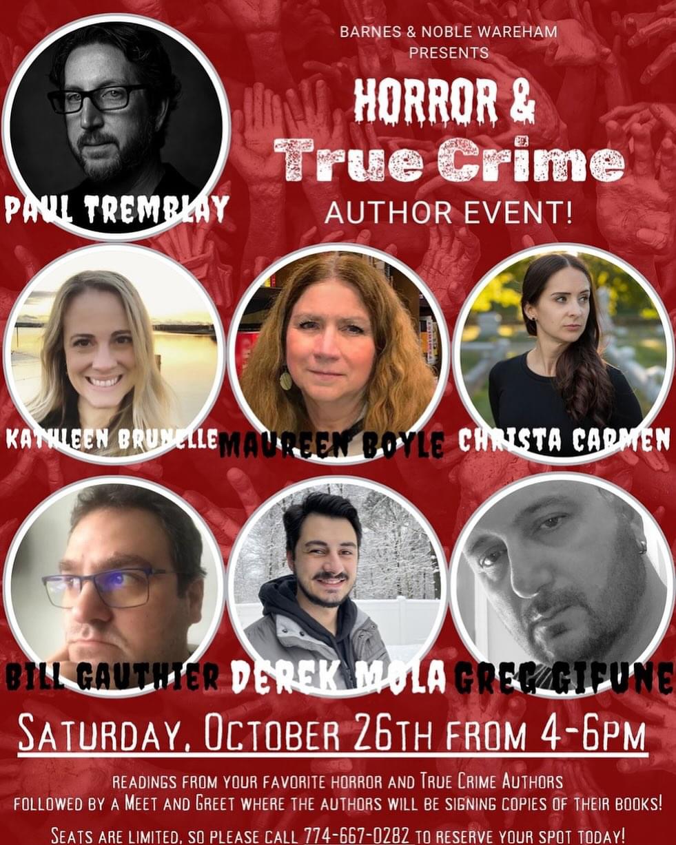 I’ll be appearing with Paul Tremblay, Greg F. Gifune, Maureen Boyle, Kathleen Brunelle, Christa Carmen, and Derek Mola at the Barnes & Noble in Wareham, Massachusetts, as part of a Halloween event!