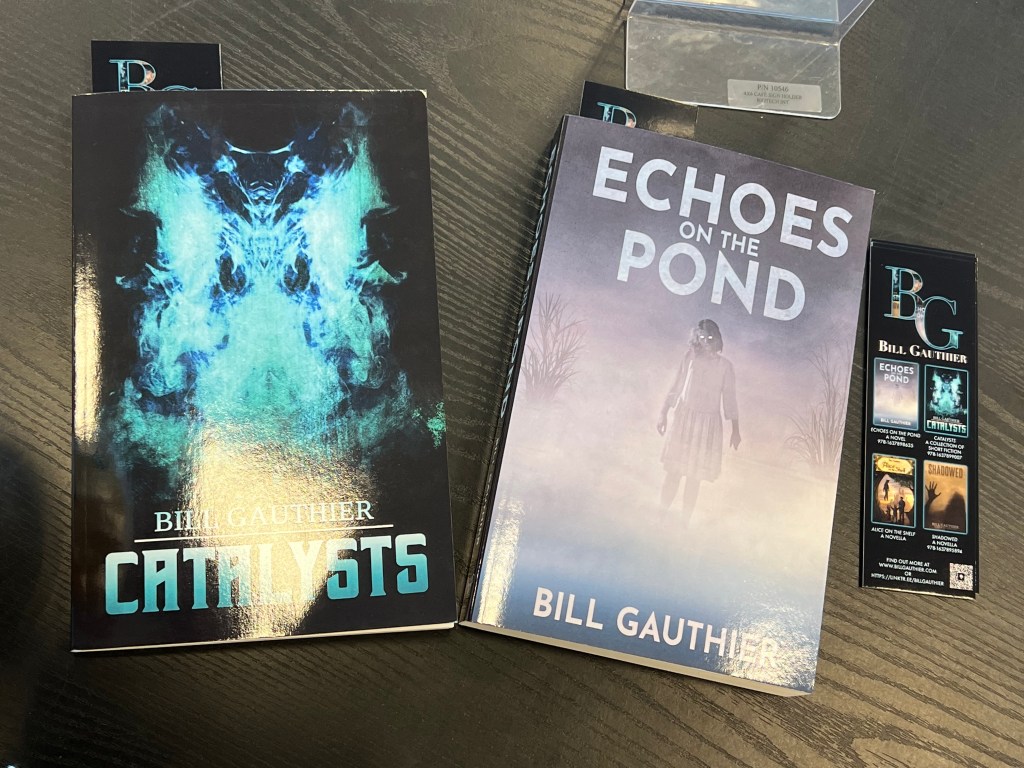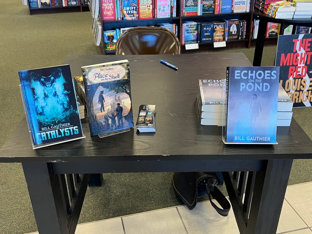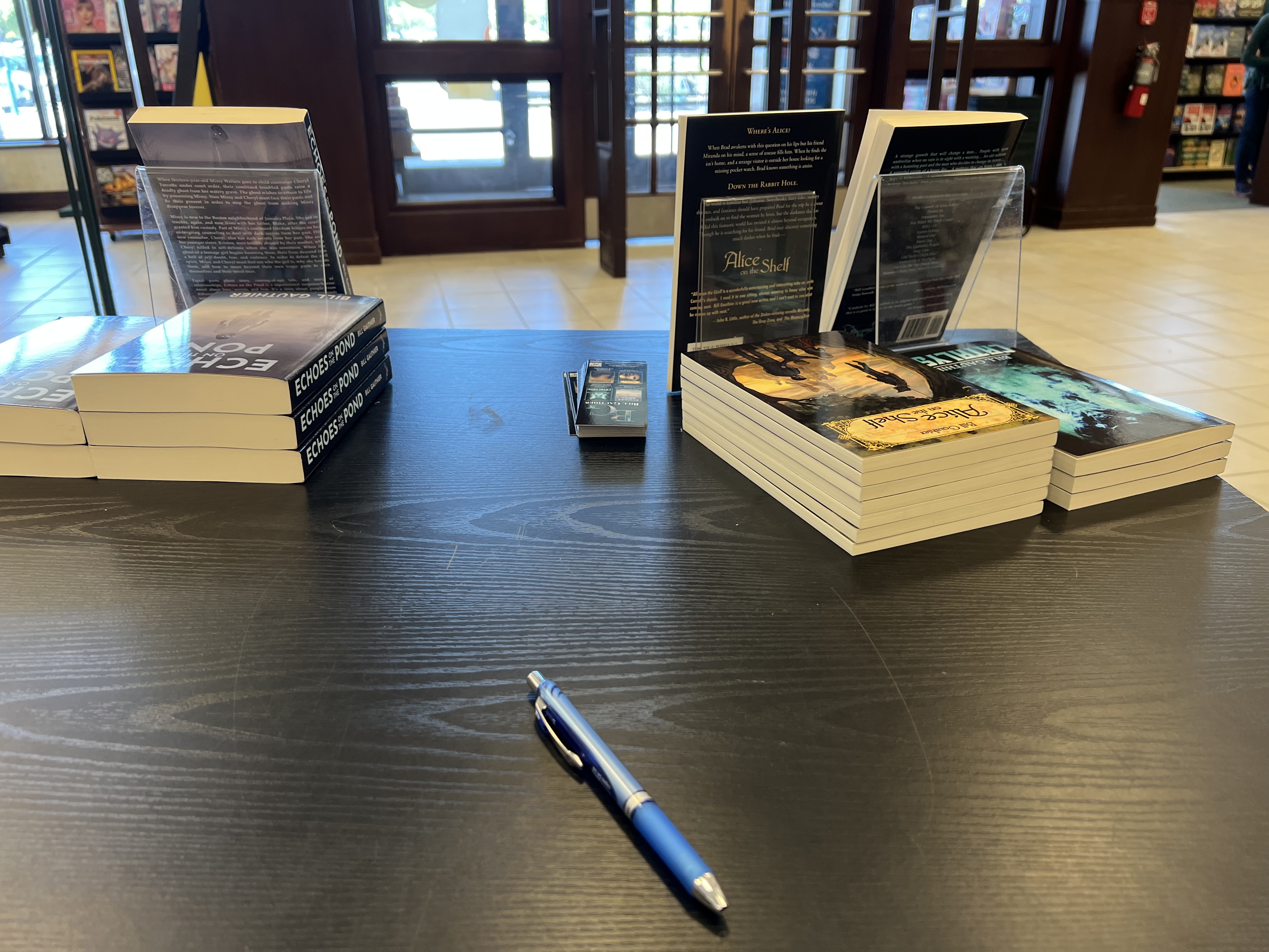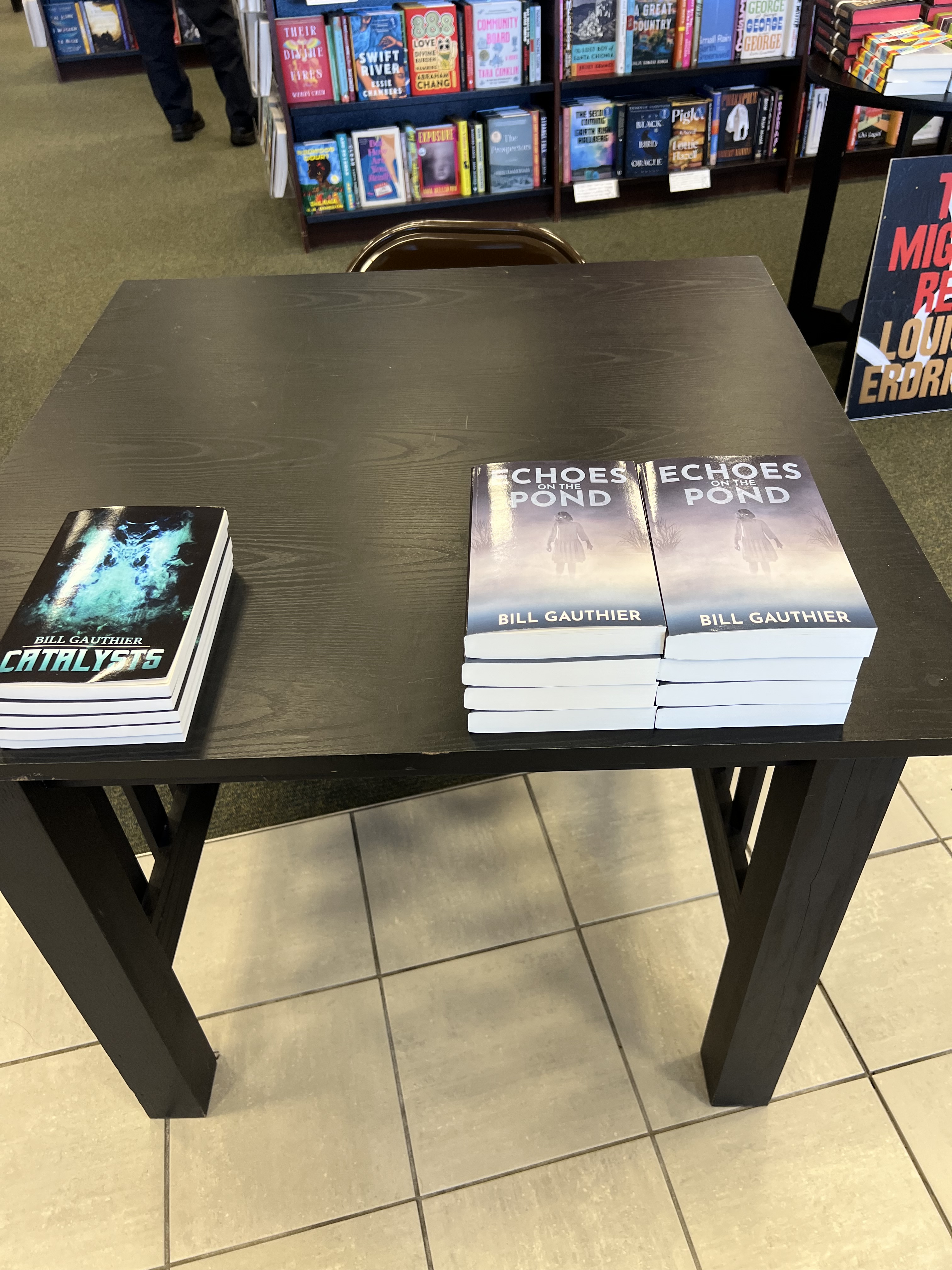 At the end, this was what I left behind. Two signed copies of Echoes on the Pond, a signed copy of Catalysts, and a few bookmarks (I brought the rest home with me). I was told that within 90 minutes after I left, the two copies of Echoes on the Pond had sold.