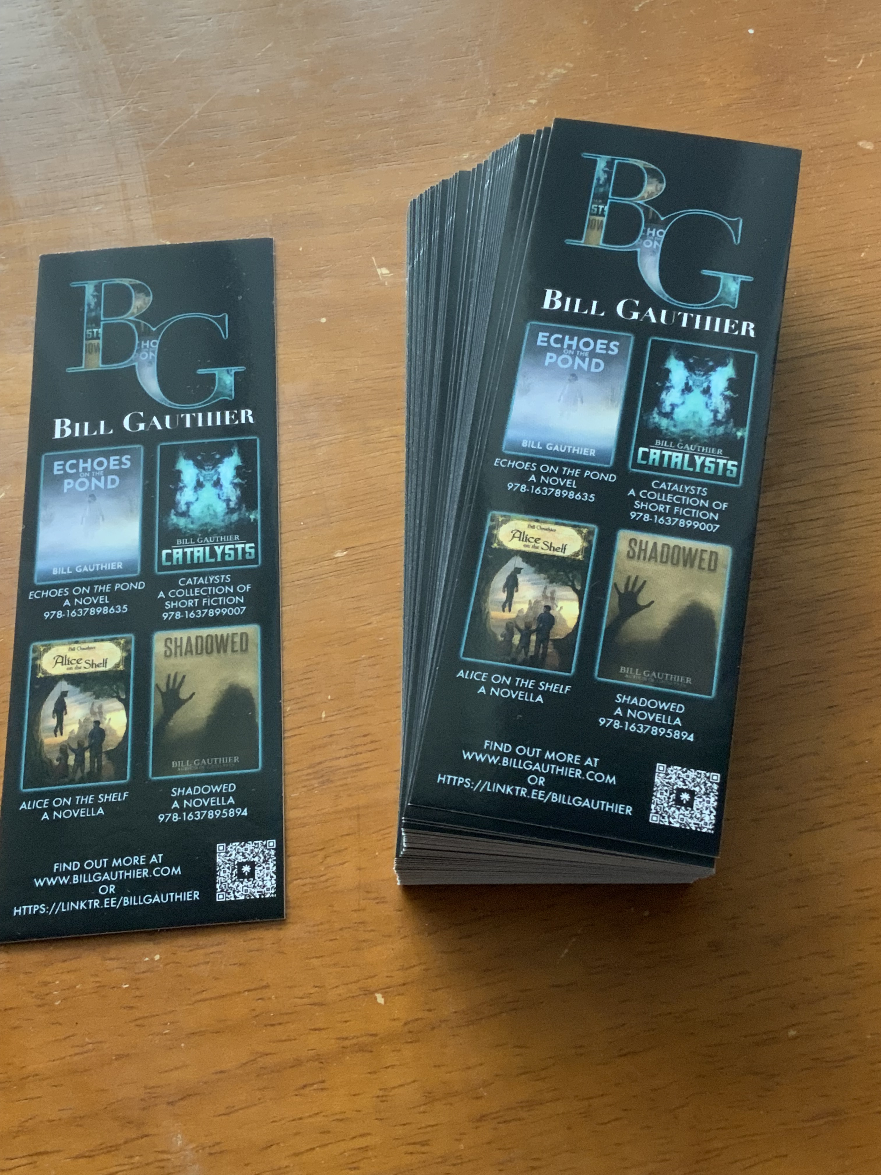 I’m pretty happy with them. I consider bookmarks an author’s business card for readers. They actually have another side that shows all the books again and the links to my website and my Linktree.