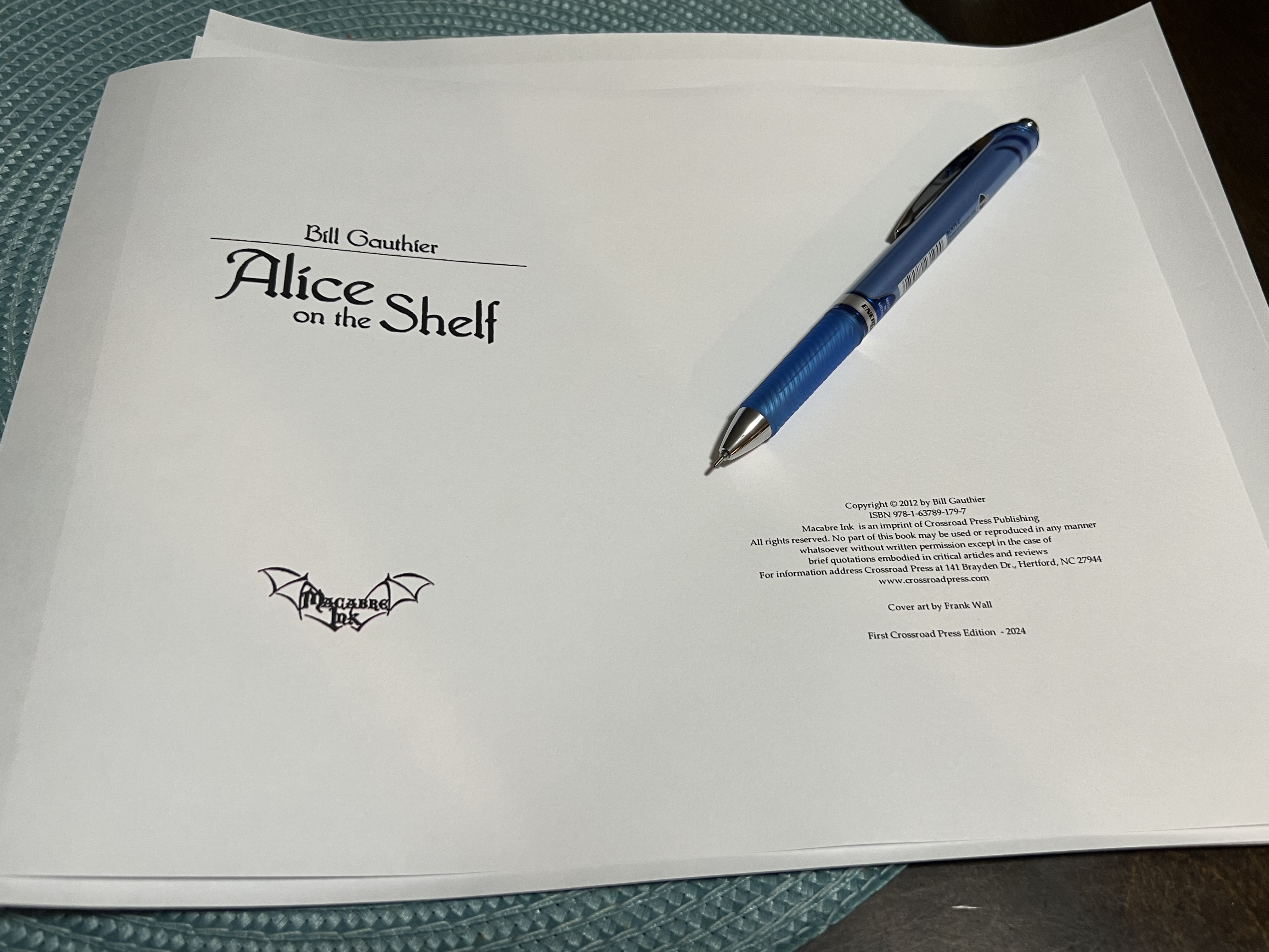 David Dodd at Crossroad Press sent me the print proofs for the new edition of Alice on the Shelf Monday night so I spent this week going through them.