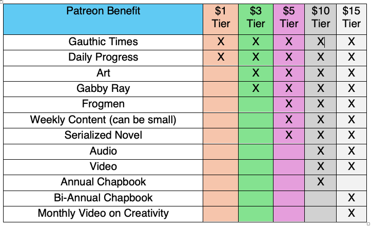 I did come up with a table to help me keep track of the Patreon tiers. The top thing should read “Gauthic Times Essay Sneak Peek.” Do you think I should post a version of this on the site itself?