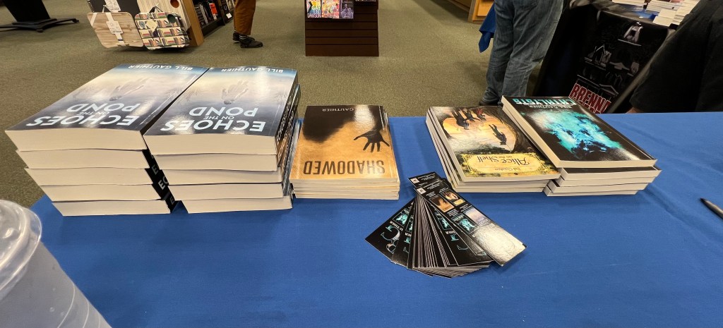 I sat at the table in the Barnes & Noble with my books stacked in front of me, the bookmarks I’d designed and had printed slightly fanned. Four other authors sat at tables that formed an L. A woman came up and engaged in some nice chit-chatter and then grabbed Shadowed and asked me to sign it. This was the second book I’d done this for that day and it made me smile.