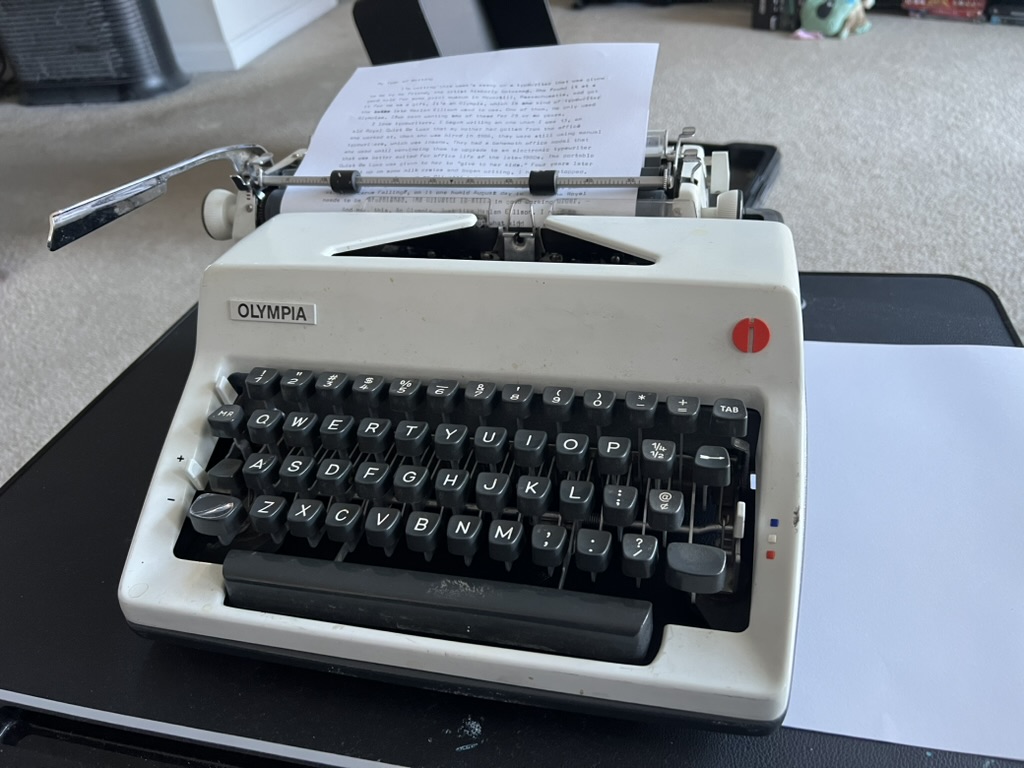 I’m writing this week’s essay on a typewriter that was given to me by my friend, the artist Kim Gatesman. She found it at a yard sale for some print museum in Haverhill, Massachusetts, and got It for me as a gift. It’s an Olympia, which is the kind of typewriter the late Harlan Ellison used to use. One of them. He only used Olympias. I’ve been wanting one of these for 25 or so years.